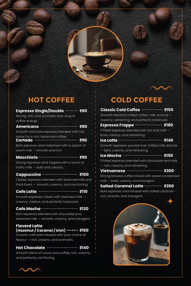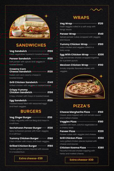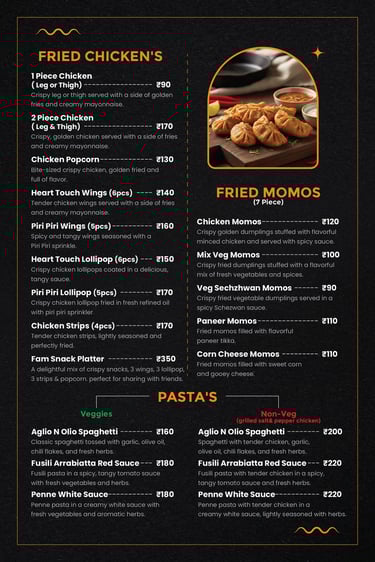 Explore our delicious range of café favorites — from crispy fried chicken to cheesy pizzas, juicy burgers, creamy pastas, and refreshing drinks.