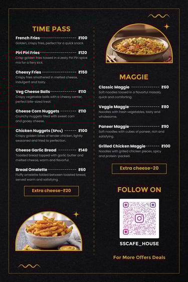 ✨ SS CAFE HOUSE ✨ Where Taste Meets Vibe! A cozy and vibrant spot to relax, chill, and enjoy your favorite flavors. From freshly brewed coffee and frappes to delicious burgers, pizzas, pastas, fried chicken, momos, sandwiches, juices, mocktails, and milkshakes — SS CAFE HOUSE has something for everyone. Perfect for friends hangouts, casual dates, or evening chill sessions, our café blends great food, good music, and a feel-good ambiance that makes every visit special. ☕ Eat. Sip. Chill. Repeat.